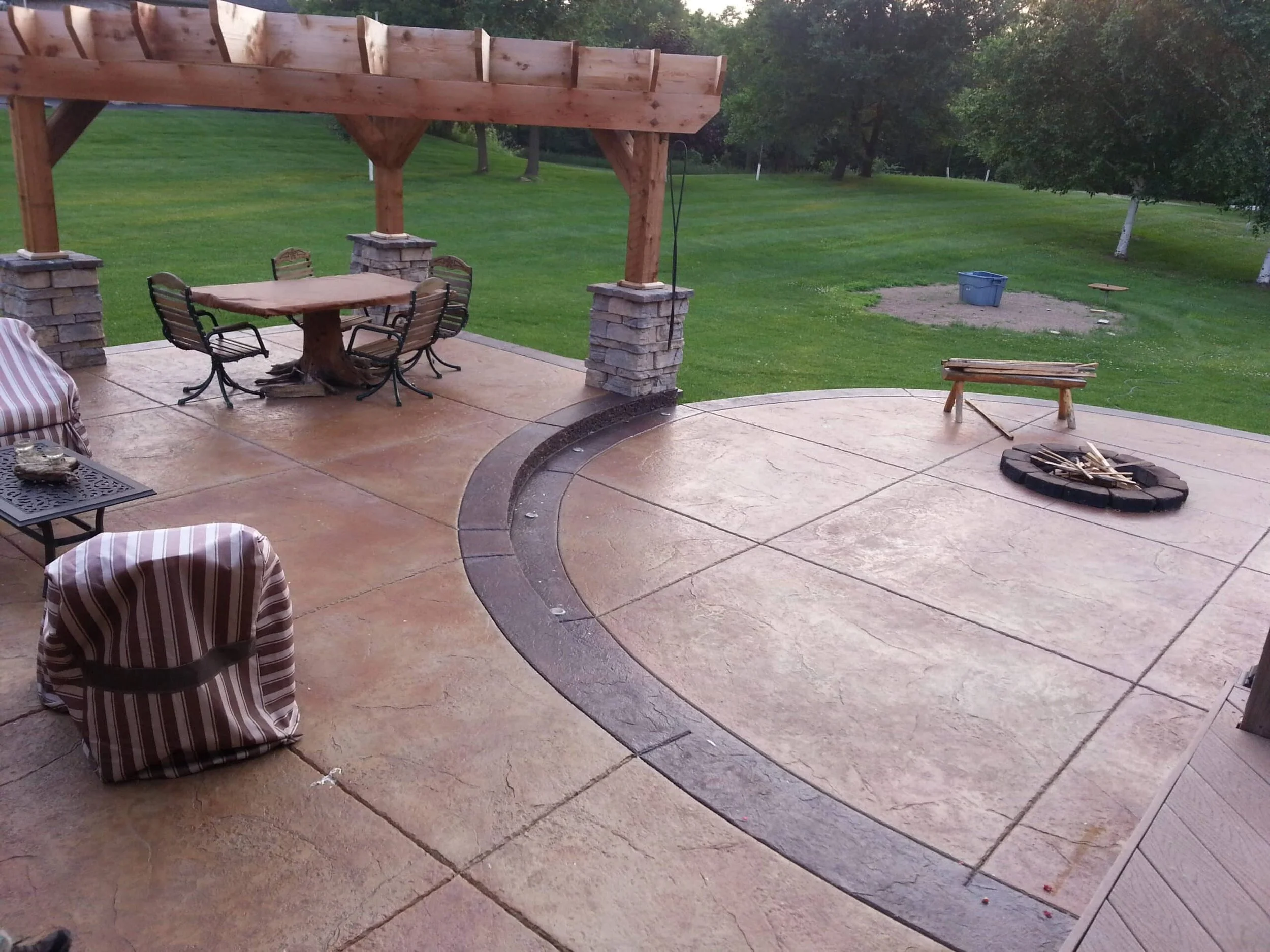 • A backyard patio with outdoor furniture, including a picnic table under a wooden pergola, armchairs with striped cushions, and a fire pit. The patio is surrounded by a grassy yard with trees in the background.